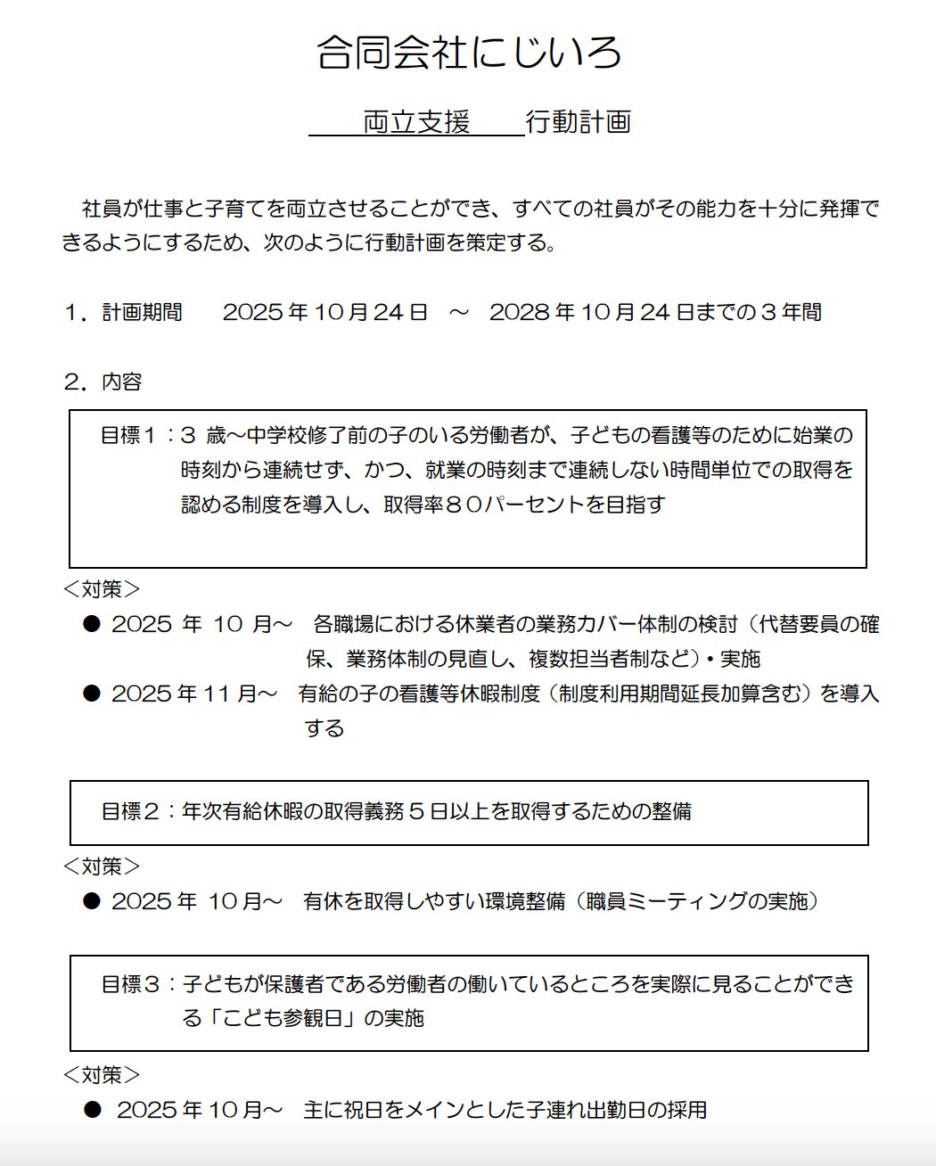 HOME > 情報公開 見える化要件について 福祉・介護職員の処遇改善につきましては、介護職員処遇改善加算の拡充が進み、「新しい経済政策パッケージ(平成29年12月8日閣議決定)において、」「福祉・介護人材確保のための取り組みをより一層高めるため、経験・技能のある職員に重点化を図りながら、職員の更なる処遇改善をすすめる。」とされ、令和元年10月の消費税引き上げに伴う報酬改定において対応することとされました。このことを受けて、令和元年度の報酬改定において、「福祉・介護職員等特定処遇改善加算」が創設されたところです。 当該加算を受けるためには、下記の要件を満たして意いる必要があります。 ①現行の処遇改善加算I〜IIIを算定していること ②職場環境要件に関し、「入職促進に向けた取り組み」や「資質の向上やキャリアアップに向けた支援」等の複数の取り組みを行っていること ③ホームページ等を通じた「見える化」を行なっていること 以上の要件に基づき、当法人における特定加算の取得状況と、賃金以外の処遇改善に関する取り組み内容を以下の通り公表します。 1.入職促進に向けた取り組み ・他産業からの転職者、主婦層、中高年齢者等、経験者・有資格者にこだわらない幅広い採用の仕組みの構築 2.資質の向上やキャリアアップに向けた支援 ・働きながら介護福祉士等の取得を目指す者に対する実務者研修受講支援や、より専門性の高い支援技術を取得しようとする者に対する喀痰吸引研修、強度行動障害支援者養成研修、サービス提供管理者研修、中堅職員に対するマネジメント研修の受講支援等 3.両立支援・多様な働き方の推進 ・子育てや家族等の介護等と仕事の両立を目指すための休業制度等の充実、事業所内託児施設の整備 4.腰痛を含む心身の健康管理 ・事故、トラブルへの対応マニュアル等の作成等の体制の整備 5.生産性向上のための業務改善の取組 ・業務手順書の作成や、記録・報告様式の工夫等による情報共有や作業負担の軽減 6.やりがい・働きがいの構成 ・ミーティング等による職場内コミュニケーションの円滑化による個々の福祉・介護職員の気づきを踏まえた勤務環境や支援内容の改善 一般事業主行動計画について ー HOME ー 更新日:2025年10月26日 author